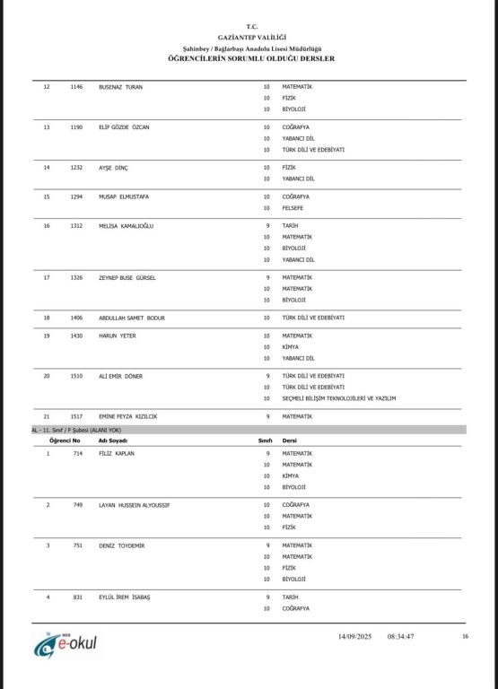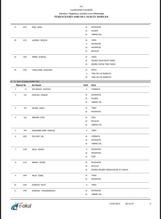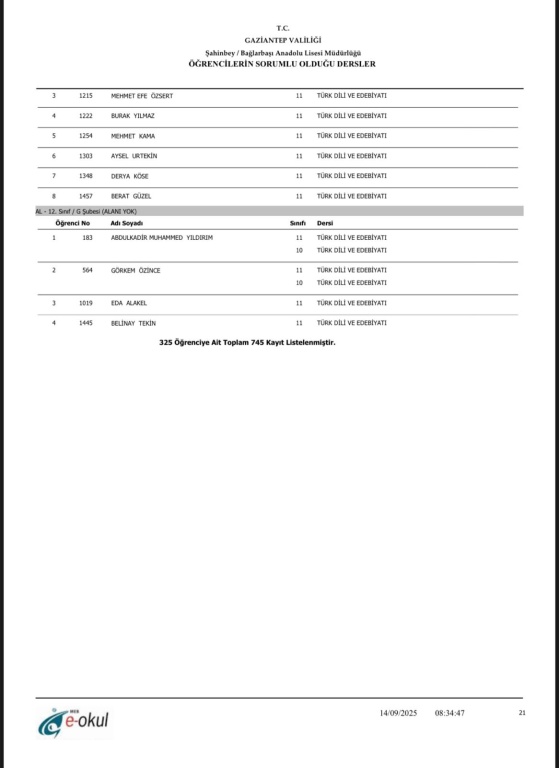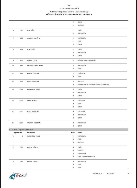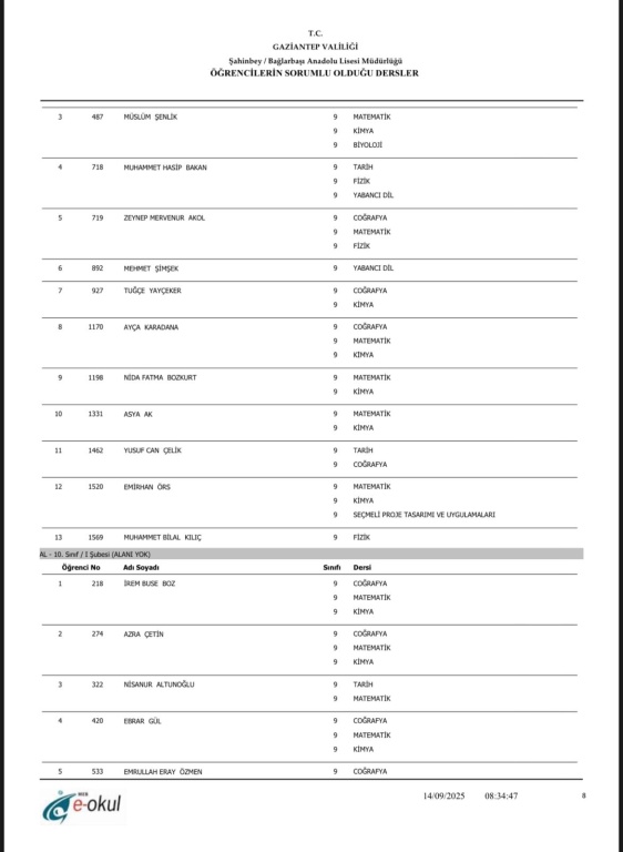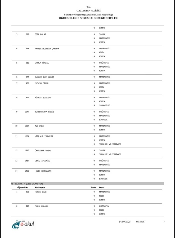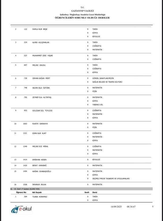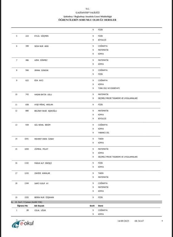Öğrencilerin Sorumlu Olduğu Ders Listesi