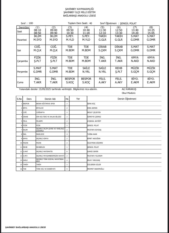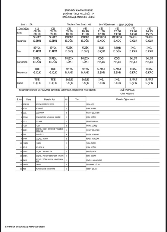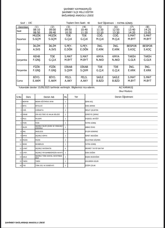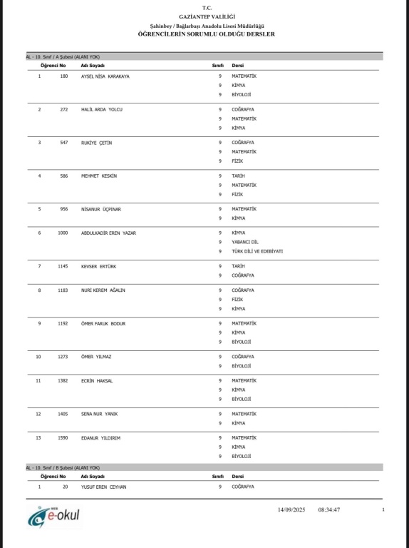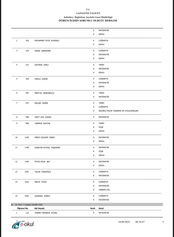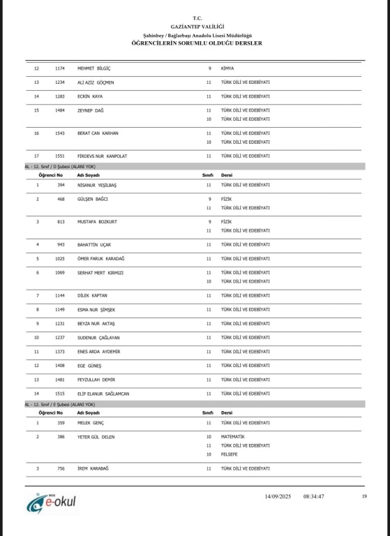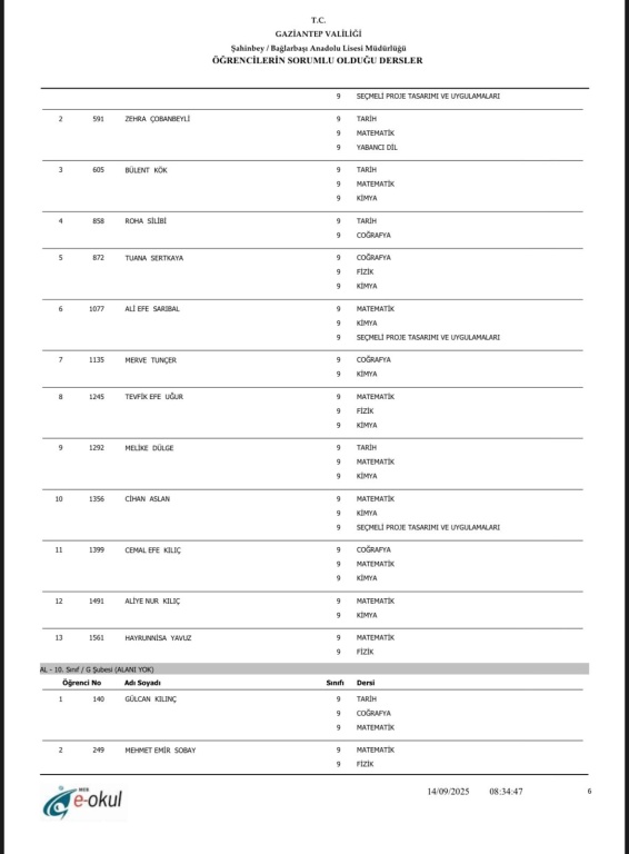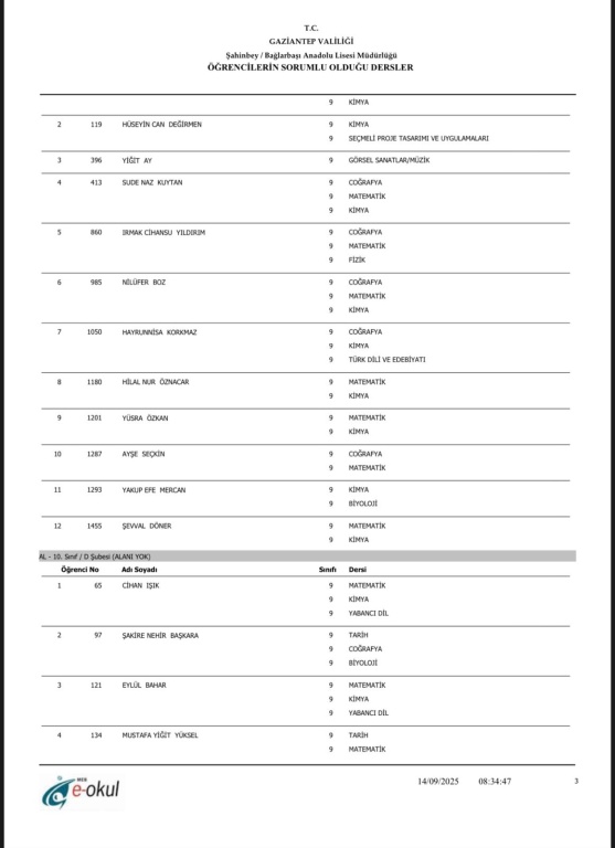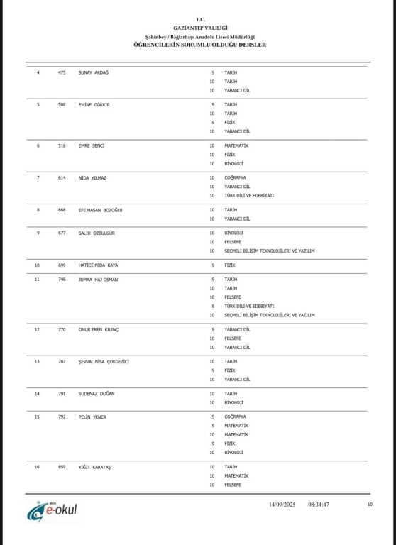 Öğrencilerin Sorumlu Olduğu Ders Listesi